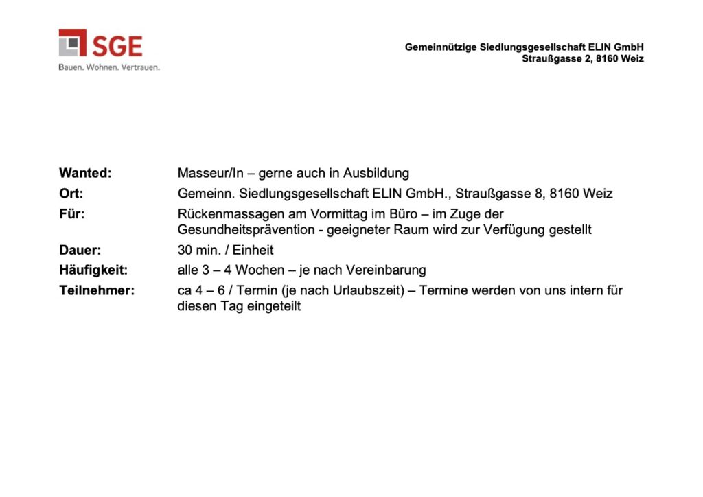 Gesucht wird eine MasseurIn- gerne mit Berufserfahrung, in Teilzeitbeschäftigung.