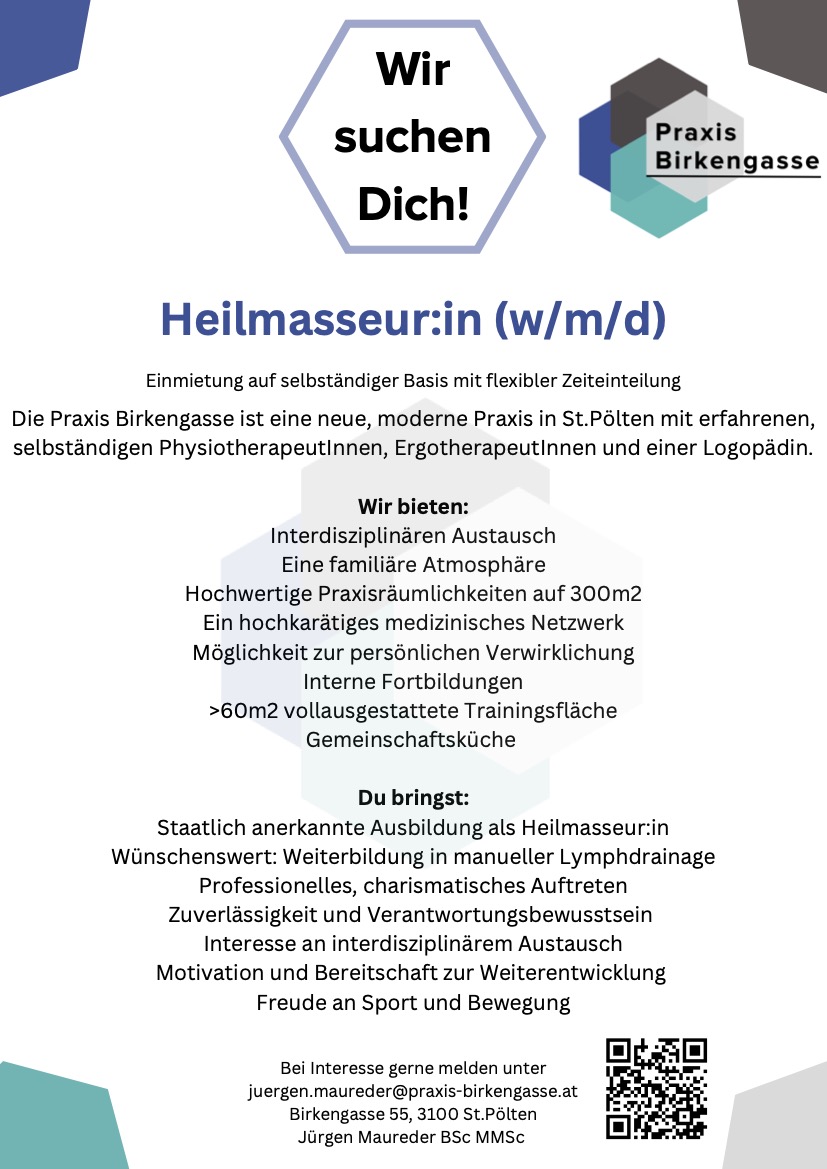 Für unsere Praxis suchen wir einen **Masseurin für 20 Stunden pro Woche**, die/der mit Empathie, Professionalität und Herzlichkeit zu uns passt. Unsere Kund*innen sollen spüren: Hier geht es um sie, um ihr Wohlbefinden und um eine Behandlung, die individuell abgestimmt ist.