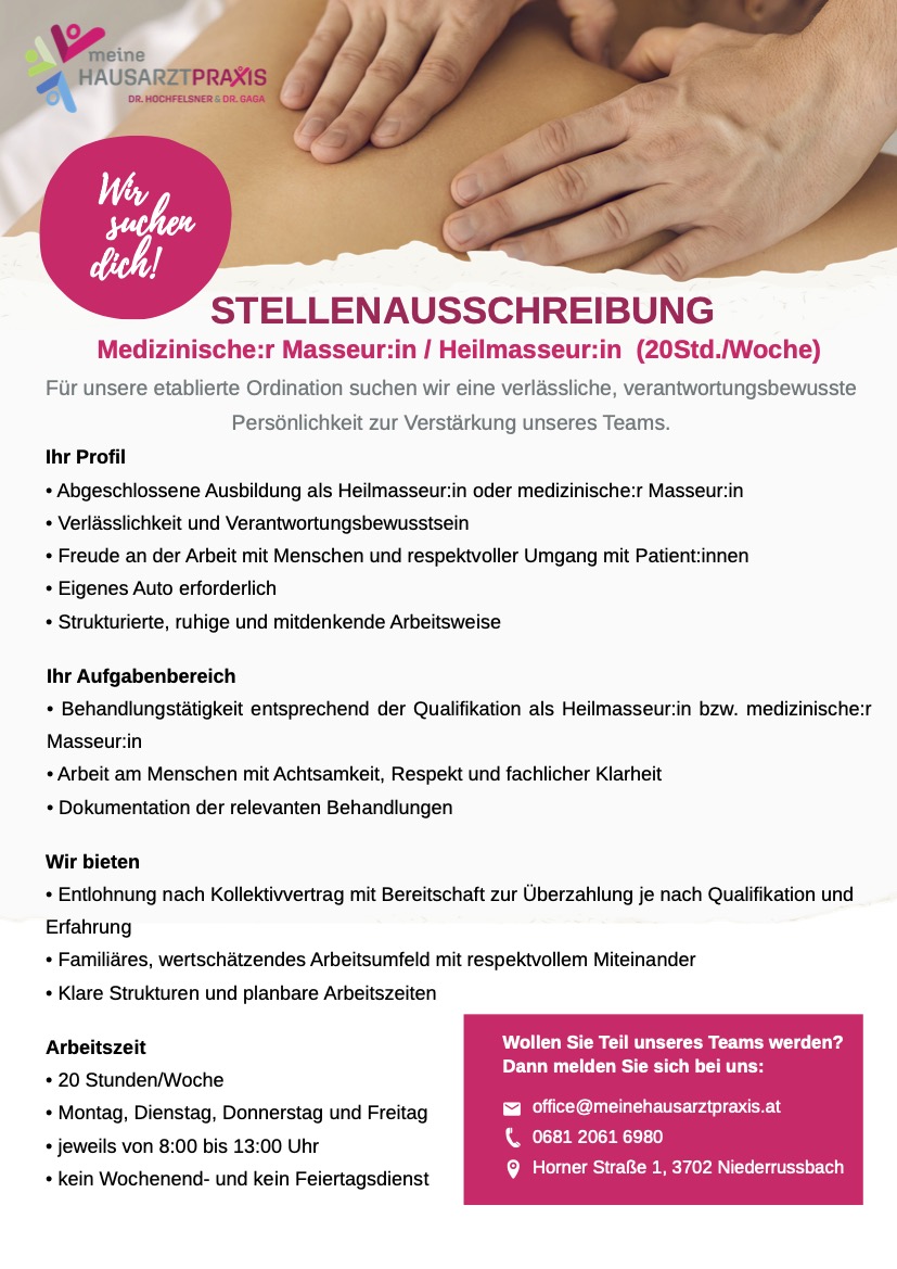 Hausarztpraxis in Niederösterreich sucht Medizinische:r Masseur:in / Heilmasseur:in (20 Std./Woche)