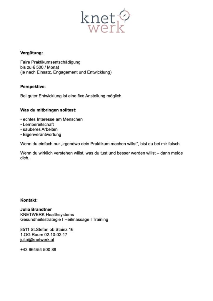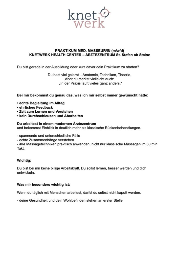 Praktikum Med. Masseur/in (m/w/d) im Knetwerk Health Center – Ärztezentrum St. Stefan ob Stainz